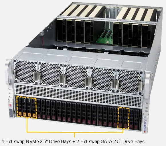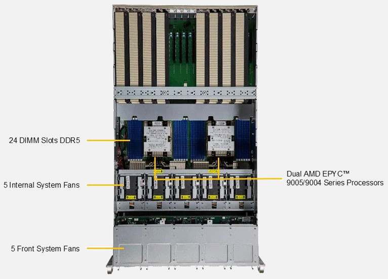 Dual AMD EPYC 9005 Series Server - Supports 8x Dual Slot GPU Accelerator Cards, 4x 2.5" NVMe & 2x SATA Hot Swap Drive Bays