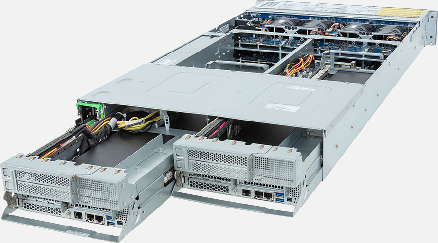 Dual Node, Dual AMD EPYC 9004 series processor(Per Node), Supports up to 4x Dual slot GPU cards, 4x 1Gb/s LAN ports (Intel® I350-AM2), 3000W Redundant Power Supply, 4x 2.5" NVMe hot-swappable drive bays.