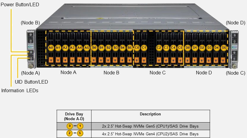 Ideal for Mission Critical HPC, Virtualized Big Data Analytics and High-Density Storage RAID Array. Quad Node 2U Form Factor. Redundant 3000W Power Supply, 6x 2.5" hot-swap NVMe/SAS drive bays (Per Node)