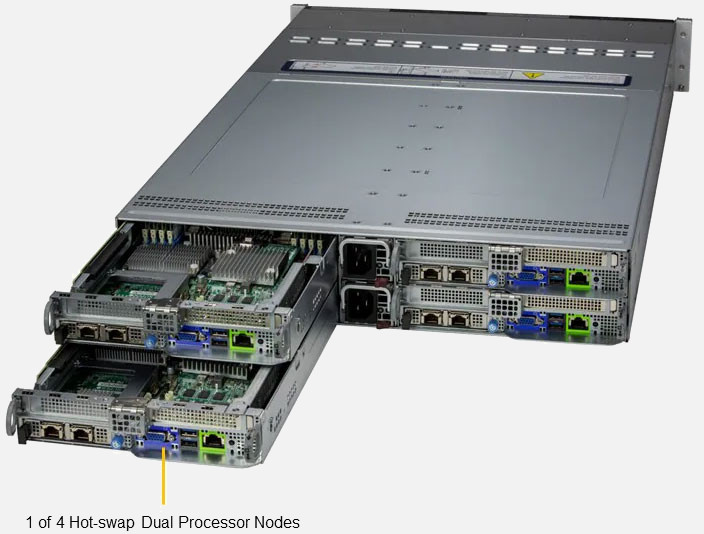 Quad node, Dual Intel Xeon 6 6700 series Processor per node. Ideal for Mission Critical HPC & Virtualised Big Data Analytics. 1x PCIe 5.0 x16 LP slot. 3600W Redundant Power Supply, 6x 2.5" NVMe/SAS Hot swap drive bays per node.