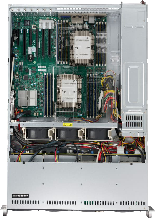 As for capacity, there's plenty of flexibility on offer. The price we've shown includes two data centre-class 1.6TB Intel P4610 NVMe SSDs, which come cabled directly to two embedded ports on the motherboard: if you want two more, Broadberry will install a dual-port PCIe controller card free of charge. The OS meanwhile is installed on a separate pair of mirrored S4S10 SSDs, tucked away in dedicated bays alongside the dual 1.2kW hotplug power supplies at the rear.