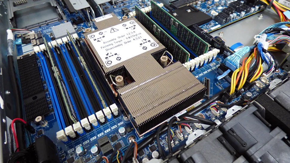 Showcasing Gigabyte's E163-S30 rack server platform, it's thermally rated to handle CPUs up to a 350W TDP so you can choose just about any model you want. Broadberry opted to keep costs under control by dropping a basic 8-core 1.8GHz Bronze 3408U CPU in our review system but you can go right up to a 60-core Platinum.