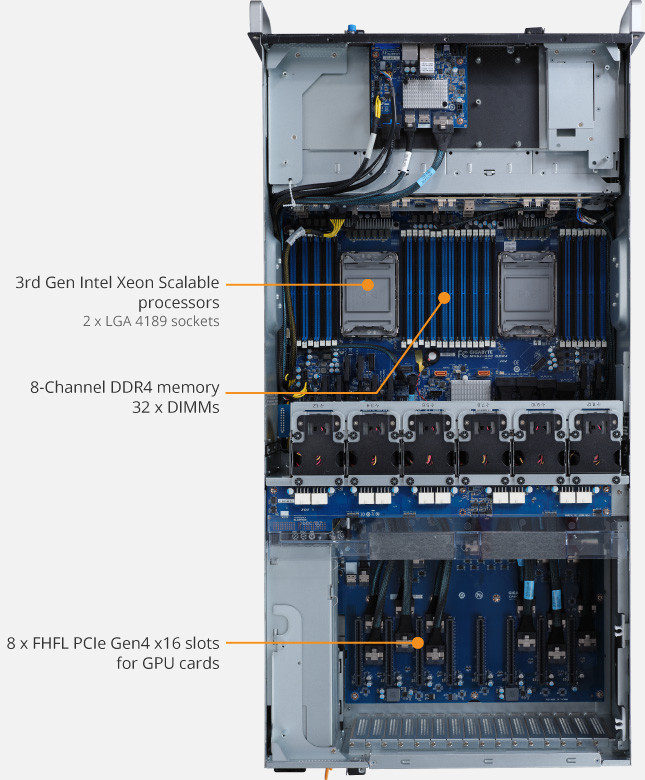 Up to 8x PCIe Gen4 GPGPU cards, dual 10Gb/s LAN ports, redundant power option.