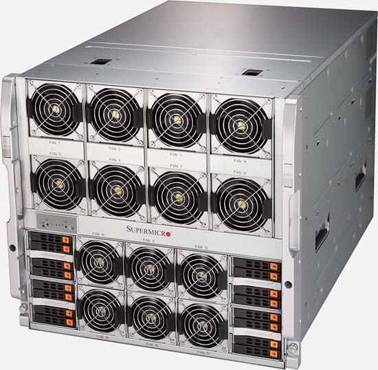 Supports 16x V100 SXM3 350W GPUs with NVSwitch and NVLink, 16x Hot-swap 2.5" NVMe drives, 6x Hot-swap 2.5" SATA3 drive bays
