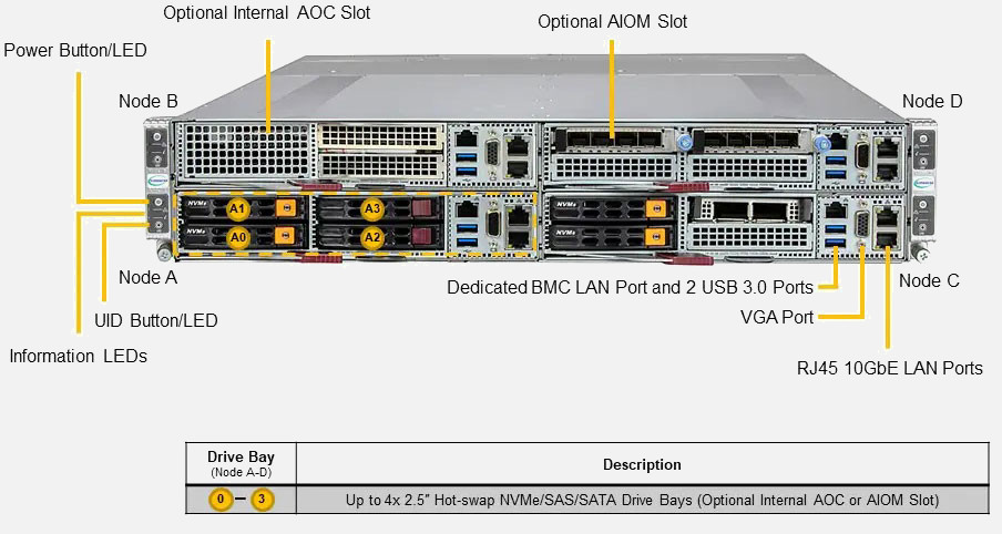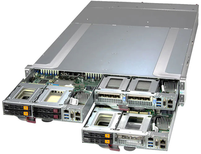 Ideal for HPC, MEC, Cloud Gaming, Multi-purpose CDN, High-availability Cache Cluster and EDA. Quad Node 2U Form Factor. Redundant 2200W Power Supply, Up to 4x 2.5" hot-swap NVMe/SATA/SAS drive bays (Per Node)