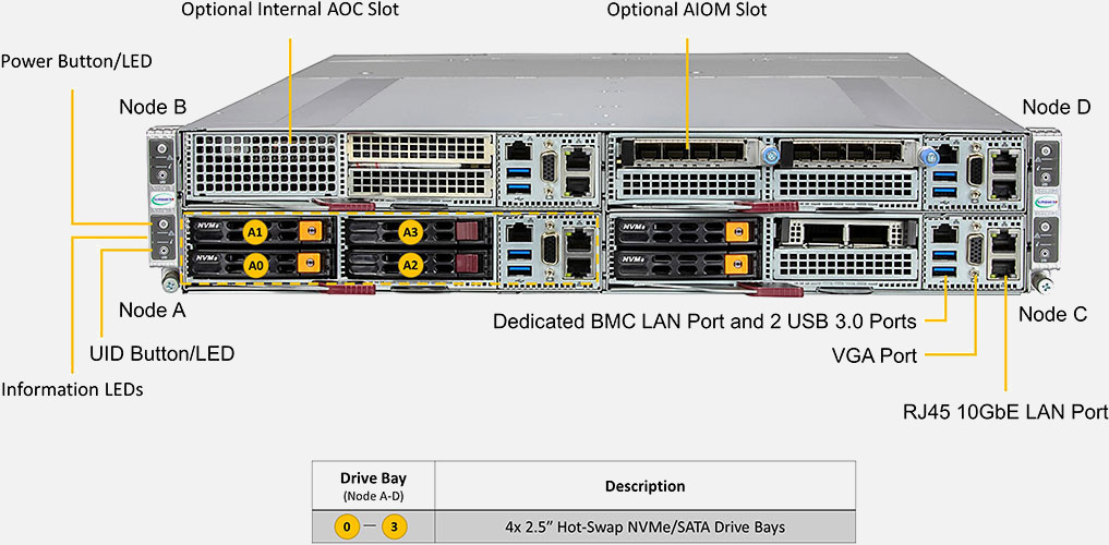 Ideal for HPC, MEC, Cloud Gaming, Multi-purpose CDN, High-availability Cache Cluster and EDA. Quad Node 2U Form Factor. Redundant 2200W Power Supply, Up To 4x 2.5" hot-swap NVMe/SATA drive bays (Per Node)