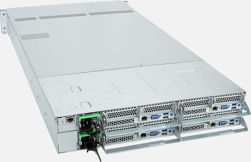 Quad Node, Dual 4th/5th Gen Intel Xeon Scalable Processors (Per Node), 4x LP PCIe Gen5 x16 slots, 2600W Redundant Power Suppply, 8x 2.5" NVMe/SATA/SAS hot-swappable drive bays.