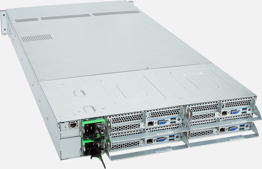 Quad Node, Dual 4th/5th Gen Intel Xeon Scalable Processors (Per Node), 4x LP PCIe Gen5 x16 slots, 3000W Redundant Power Suppply, 8x 2.5" NVMe/SATA/SAS hot-swappable drive bays.