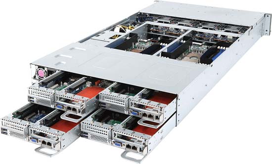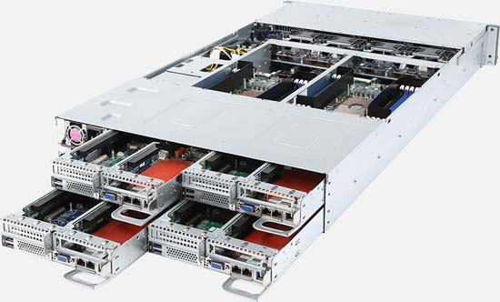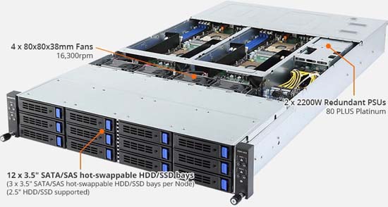 2U - 4 nodes with rear access to the node trays, 8x 10Gb/s BASE-T LAN ports (Intel® X550-AT2), 12x 3.5" SAS/SATA hot-swappable HDD/SSD bays