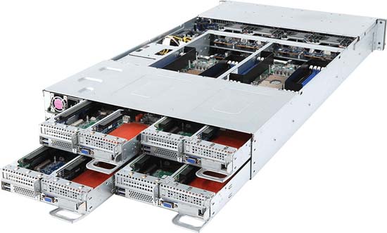 2U - 4 nodes with rear access to the node trays, 12x 3.5" SAS/SATA hot-swappable HDD/SSD bays, 8x Low profile PCIe Gen3 expansion slots