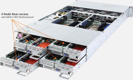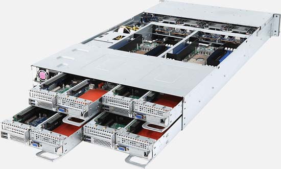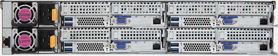 2U - 4 nodes with rear access to the node trays, 8x 2.5" U.2 and 16 x SATA/SAS hot-swappable HDD/SSD bays, 8x Low profile PCIe Gen3 expansion slots, redundant power option