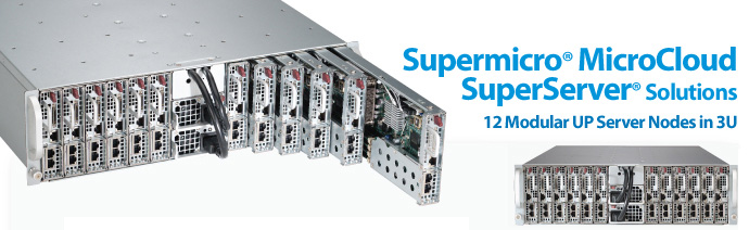 The Supermicro MicroCloud modular server system provides 12 modular server nodes conveniently integrated into a 29" deep chassis. These hot-pluggable server nodes operate independently. Each node is powered by Intel Xeon E3-1200 V2 series processor and provides up to 32GB ECC DDR3 1600MHz memory, support for MicroLP cards and 2x 3.5" or 4x 2.5" SATA hard drives.