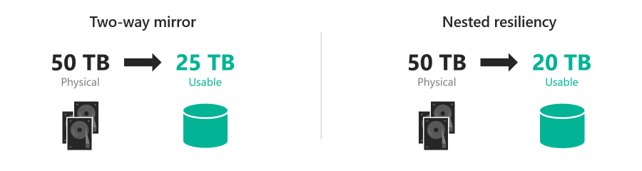 For example, storing data without any resiliency is 100% capacity efficient (as 1 TB physical storage capacity). In comparison, two-way mirroring is 50% efficient (1 TB of data will take up 2 TB of physical storage capacity).