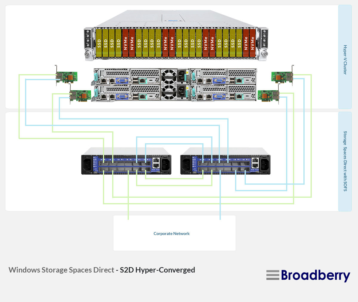 Networking Hardware Storage Spaces Direct utilises SMB3, including SMB Direct and SMB Multichannel, over Ethernet in order to communicate between servers.
