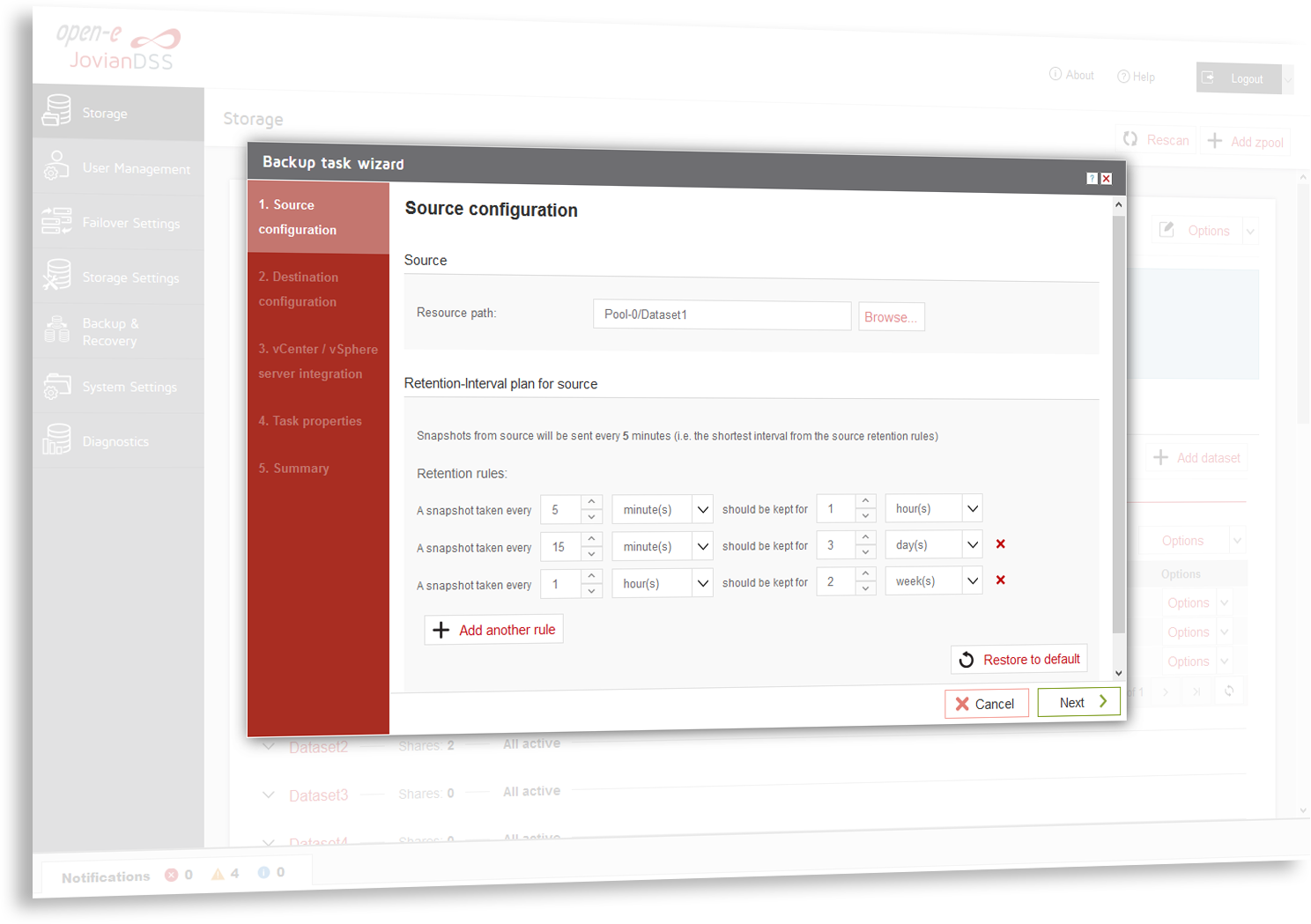 With Open-E JovianDSS on- and off-site data protection, you can create rotational auto-snapshots of NAS or SAN volumes according to instructed set by a retention-interval plan.
