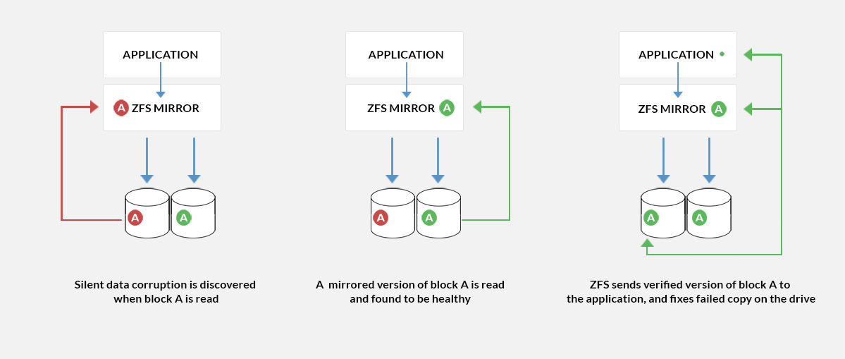 ZFS has a method for preventing silent data corruption. First an application issues a read, then ZFS mirror tries the first disk. Checksum reveals that the block is corrupted on the disk. ZFS tries the second disk and checksum indicates that the block is good. ZFS returns the good data to the application and repairs the damaged block in a process called self-healing.