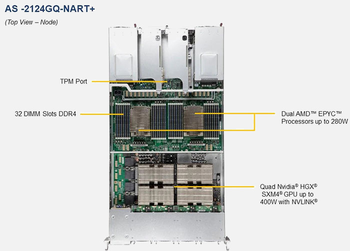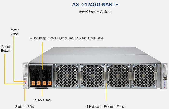 The Supermicro A+ Server 2124GQ-NART+ | AS-2124GQ-NART+ supports the AMD AMD EPYC "ROME" Gen 2 , AMD EPYC "Milan" Gen 3 family in a high-density 2U form-factor. These SuperServers are ideal for network infrastructure, front-end enterprise, and minimal-downtime cluster server systems.