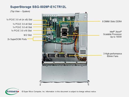 The Supermicro SSG-5029P-E1CTR12L SuperStorage | 5029P-E1CTR12L supports the Intel Intel Xeon Scalable Processors 2nd Generation family in a high-density 2U form-factor. These SuperServers are ideal for network infrastructure, front-end enterprise, and minimal-downtime cluster server systems.