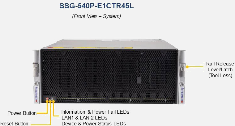 The Supermicro UP Storage SuperServer SSG-540P-E1CTR45L | SSG-540P-E1CTR45L can be configured with 2.5" drives, a more space efficient and low noise option. These drives also offer energy savings and increased flexibility.