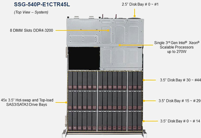 Optimised for database applications, backup storage and cold storage.45x Top-loading hot-swap drives. Redundant power supply.