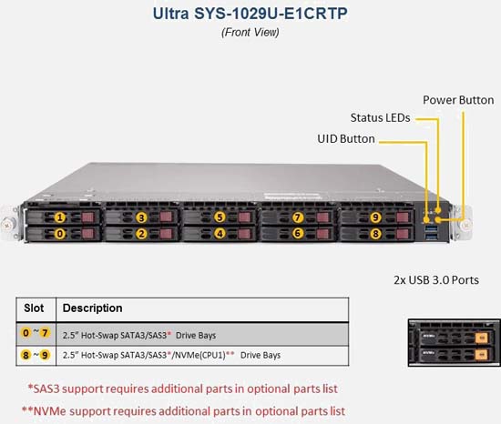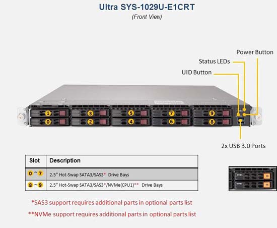 The Supermicro SuperServer 1029U-E1CR4 | SYS-1029U-E1CR4 can be configured with 2.5" drives, a more space efficient and low noise option. These drives also offer energy savings and increased flexibility.