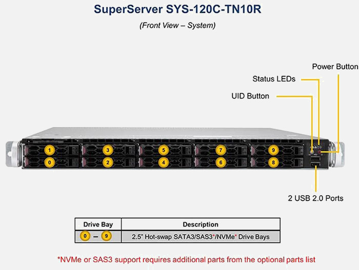 The Supermicro CloudDC SuperServer SYS-120C-TN10R | SYS-120C-TN10R can be configured with 2.5" drives, a more space efficient and low noise option. These drives also offer energy savings and increased flexibility.