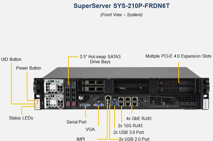The Supermicro IoT SuperServer SYS-210P-FRDN6T | SYS-210P-FRDN6T can be configured with 2.5" drives, a more space efficient and low noise option. These drives also offer energy savings and increased flexibility.