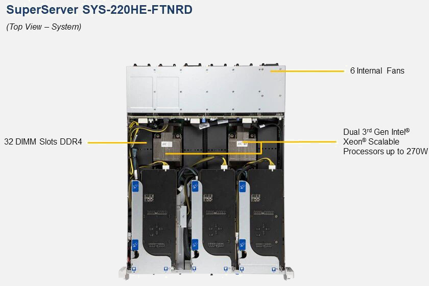The Supermicro Hyper SuperServer SYS-220HE-FTNRD | SYS-220HE-FTNRD can be configured with 2.5" drives, a more space efficient and low noise option. These drives also offer energy savings and increased flexibility.