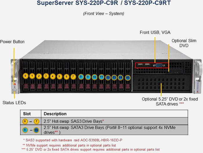 The Supermicro SuperServer SYS-220P-C9RT | SYS-220P-C9RT can be configured with 2.5" drives, a more space efficient and low noise option. These drives also offer energy savings and increased flexibility.