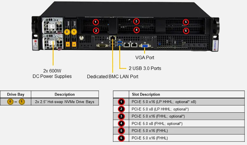 Ideal for AI, Machine Learning, Cloud Computing, Edge and Network Function Virtualisation. Up to 2x PCI-E 5.0 x16 FHHL slots, 2x PCI-E 5.0 x8 HHHL slots. Redundant DC 800W Power Supply, 2x 2.5" hot-swap NVMe drive bays