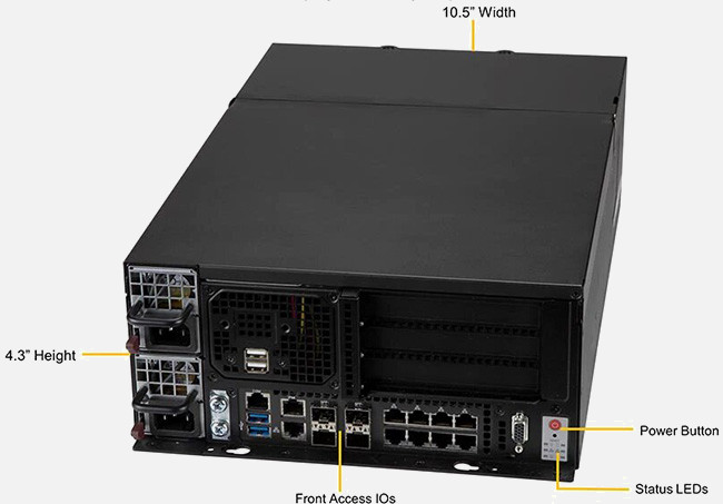 Optimised for Multi-Access Edge Computing (MEC), Network Function Virtualisation (NFV), Edge Computing and more. 2 PCI-E 3.0 x16. 9 GbE (one for Ethernet management), 4x 10G SFP+, 1 Dedicated IPMI LAN port.