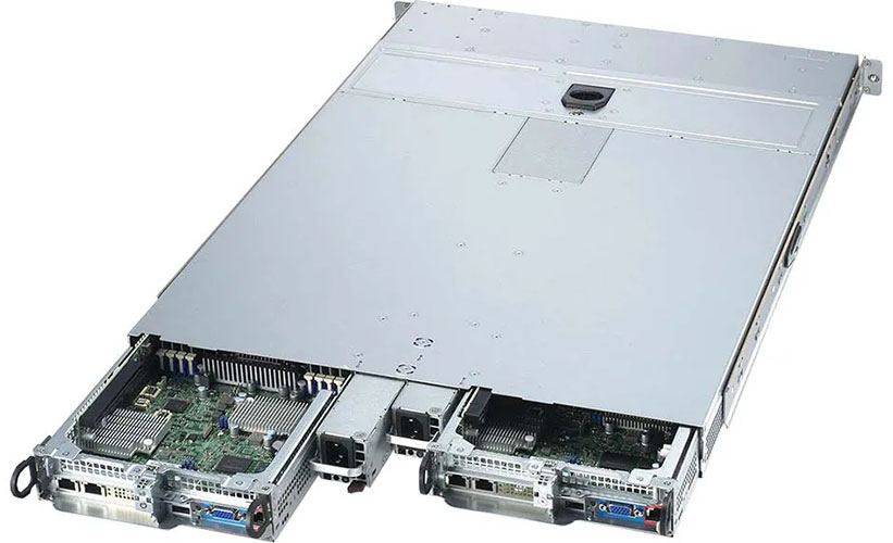 This server was designed to increase computing density while reducing cost, as well space and energy requirements. This 1U Twin supports Intel Xeon Scalable processors.