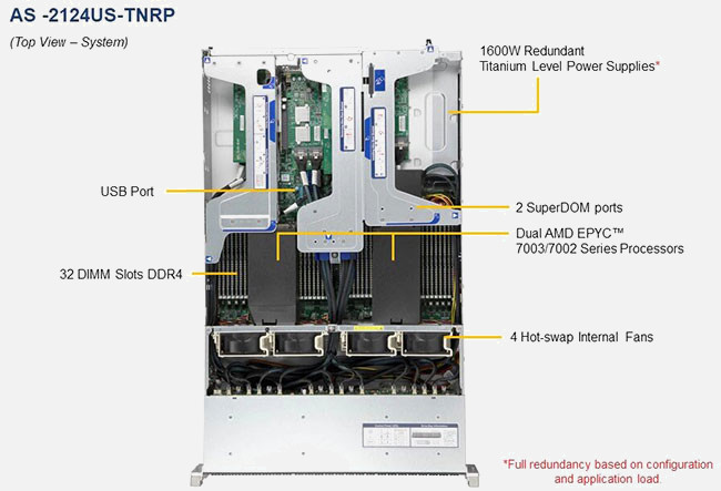 The Supermicro A+ Server 2124US-TNRP | AS-2124US-TNRP supports the AMD AMD EPYC "ROME" Gen 2 , AMD EPYC "Milan" Gen 3 family in a high-density 2U form-factor. These SuperServers are ideal for network infrastructure, front-end enterprise, and minimal-downtime cluster server systems.