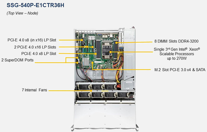 The Supermicro UP Storage SuperServer SSG-540P-E1CTR36H | SSG-540P-E1CTR36H supports the Intel Intel Xeon Scalable Processors 3rd Generation family in a high-density 4U form-factor. These SuperServers are ideal for network infrastructure, front-end enterprise, and minimal-downtime cluster server systems.